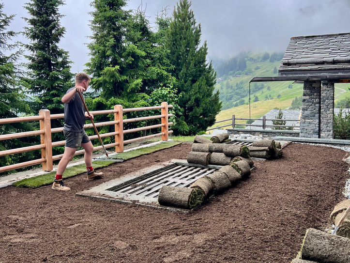We transformed the space surrounding the chalet into a multi-levelled garden, featuring a tailored dry stone wall, new turf and slab steps down to a pre existing decking.